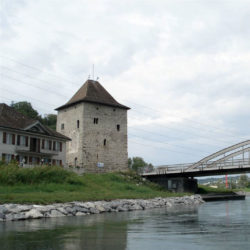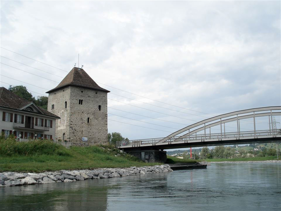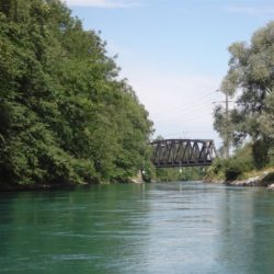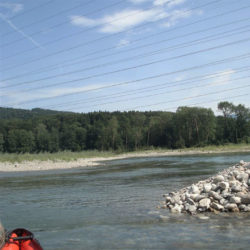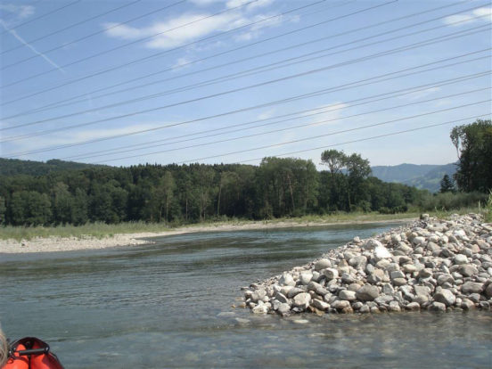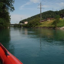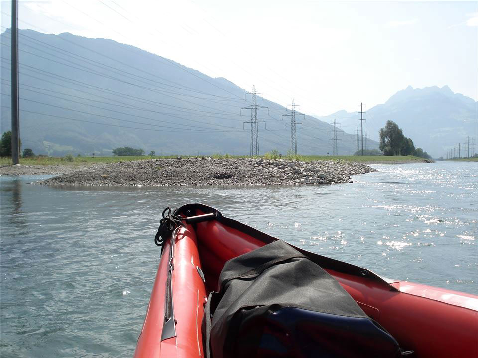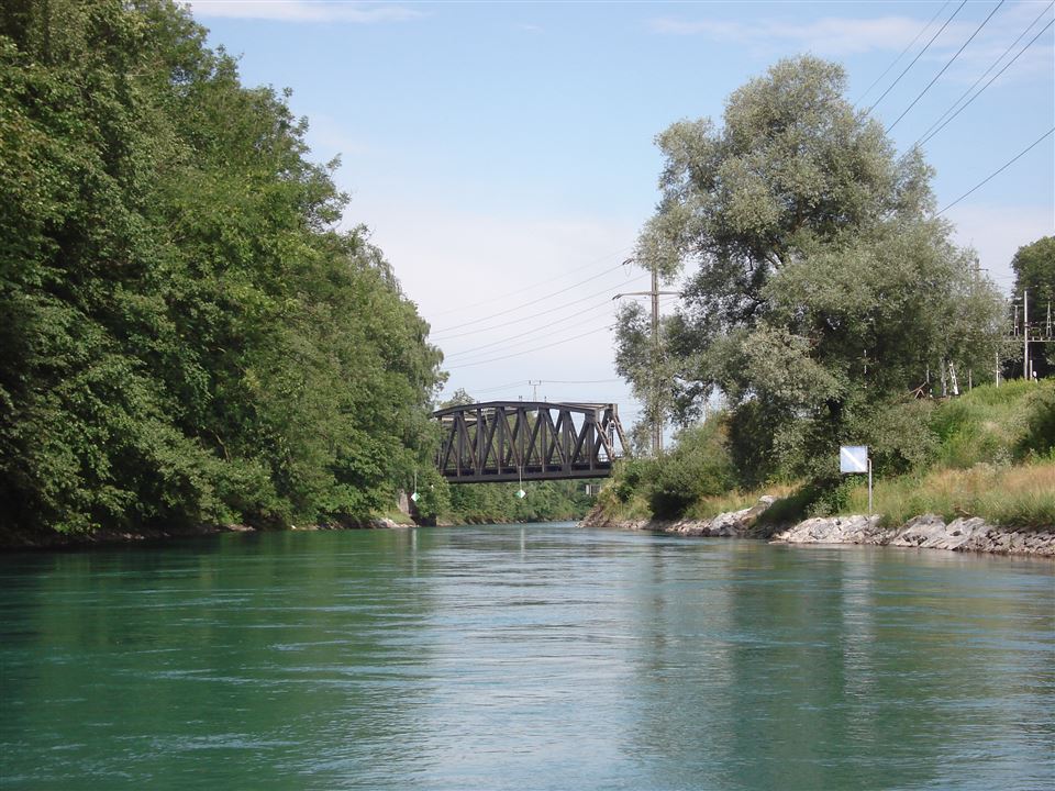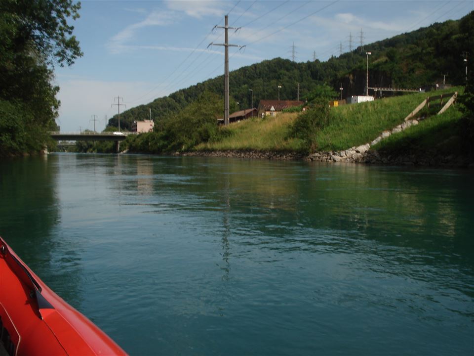 Kurz nach dem Bahnhof Ziegelbrücke folgt das erste und einzige Hinderniss: eine Stromschnelle. Die Ideallinie ist gekennzeichnet und befindet sich in der Mitte des Kanals. Beim aktuellen Wasserstand (56 m3/sek) lässt sich die Stelle gut fahren. Am Rand hat es starke Kehrwasser, so dass man rasch dorthinein geräht; eine gute Linie und etwas Tempo macht das Ganze einfacher.