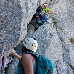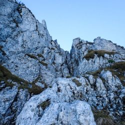 Den Wegspuren folgend über steiles Grasgelände hinauf bis zum Kamin (II). Dieses erklettert man und steht direkt auf dem Gipfel (Kamin mit Bohrhaken ausgerüstet).