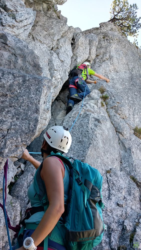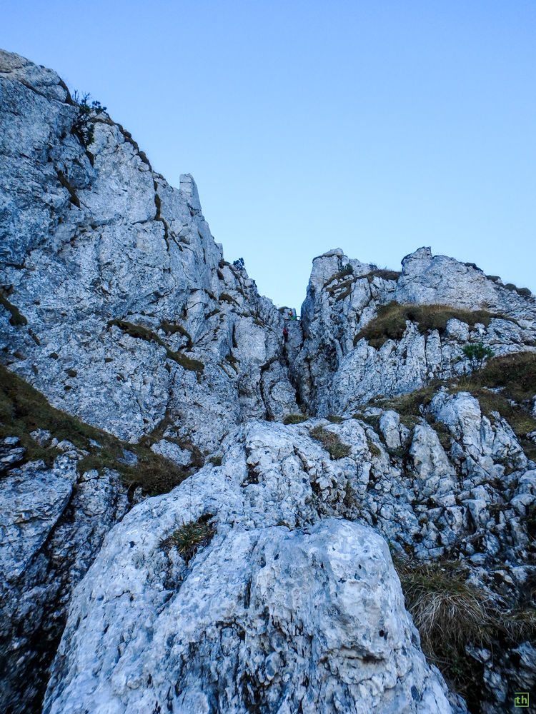 Den Wegspuren folgend über steiles Grasgelände hinauf bis zum Kamin (II). Dieses erklettert man und steht direkt auf dem Gipfel (Kamin mit Bohrhaken ausgerüstet).