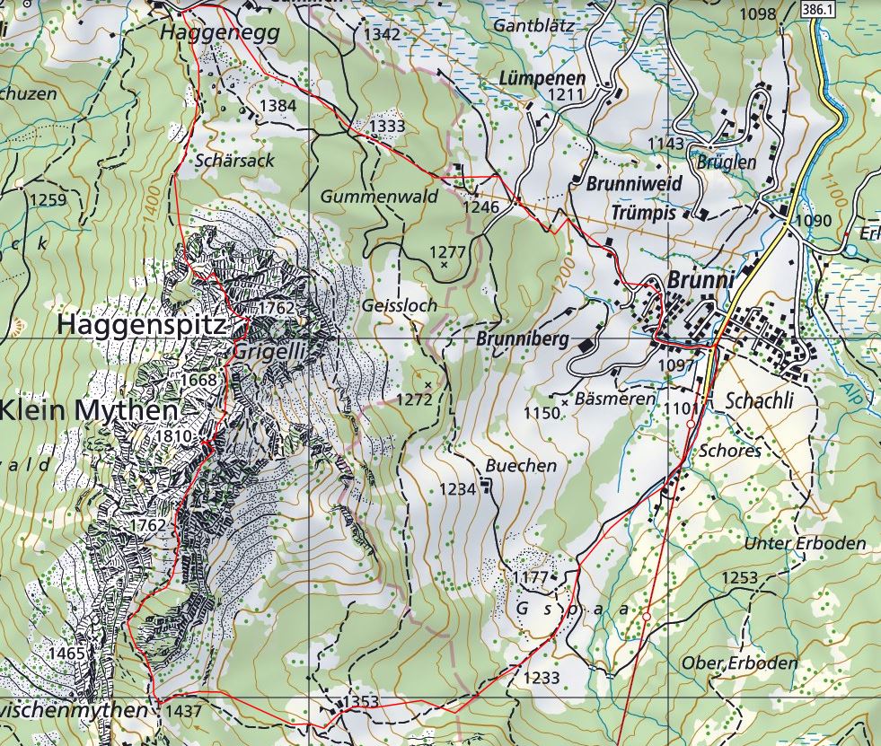 Vom Brunni wandert man auf markiertem Weg zur Haggenegg. Über einen mehr oder weniger gut sichtbaren Weg zum Fuss de Haggensptizes. Den spradischen Markierungen (rote Punkte und Pfeile) entlang durch die abwechselnd grasbewachsene und felsige Nordflanke des Haggenspitzes. In der Mitte des Aufstiegs an einem Borhaken vorbei über eine abschüssige Querung (II). Weiter aufwärts bis sich die Markierungen verzweigen. Rechts gehts zum rund 25 m hohen Müllerkamin (III+), das mit Bohrhaken ausgerüstet ist. Anschliessend in leichter Kletterei zum Gipfel. Über die steile Südflanke (T5) nach Grigelli.